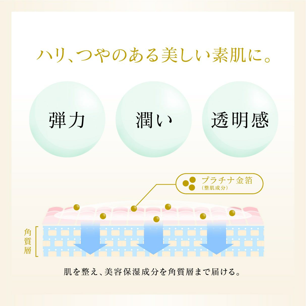 プラチナ金箔※は、化粧品に配合されている美容保湿成分とともにキメを整え、肌をつややかに輝かせます。
