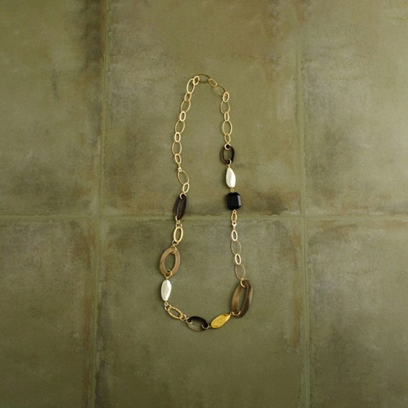 商品説明ランダムなカットが美しい、楕円型のアクリルパーツを2色の箔でくるみました。リング型の水牛角ホーンパーツの、しっとりと深みのある質感、ベージュからブラウンへの柔らかなカラーグラデーションは、天然素材ならではのもの。一粒入った黒い水牛角ホーンのスクエアパーツが、全体を引き締めています。装いのポイントになる抜群の存在感ながら、つけ心地が非常に軽いのもポイントです。