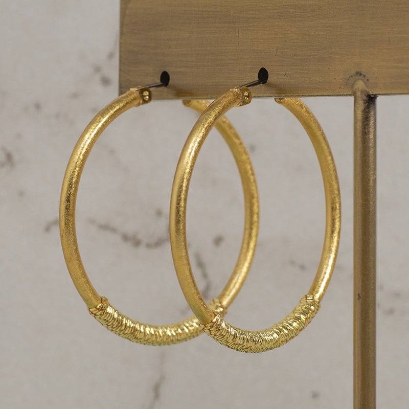フープ型のピアスに箔を施し、銀糸を丁寧に巻きつけたミニマルなデザイン。
