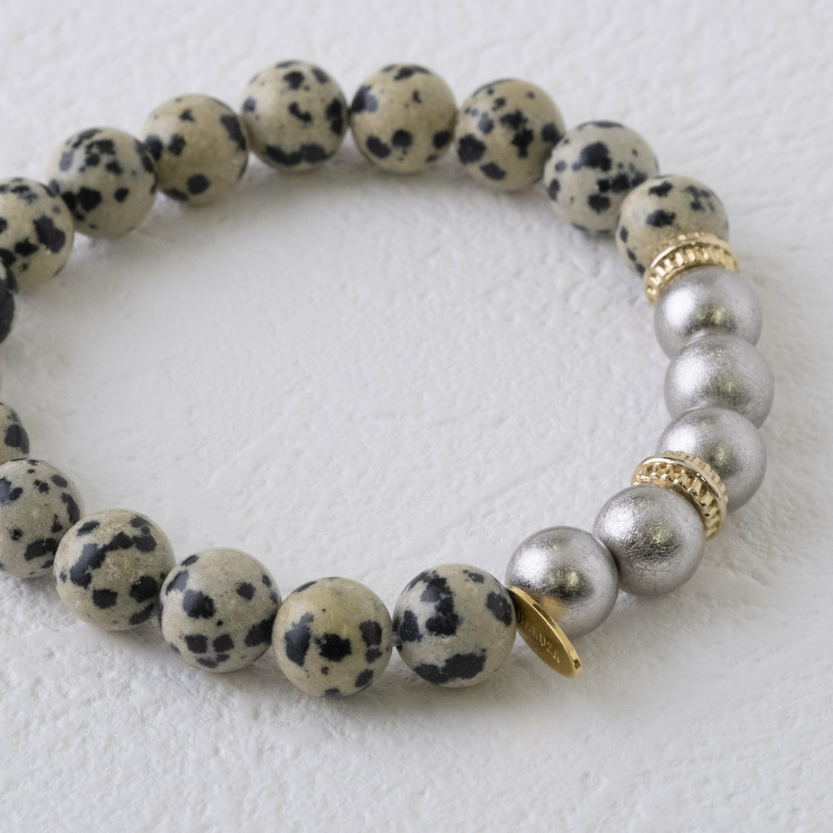犬のダルメシアンにそっくリな柄のダルメシアンジャスパー。モノトーンのスタイリッシュな雰囲気にもマッチするプラチナ箔と合わせました。装いに、大人の遊び心と可愛らしさをプラスしてくれます。
