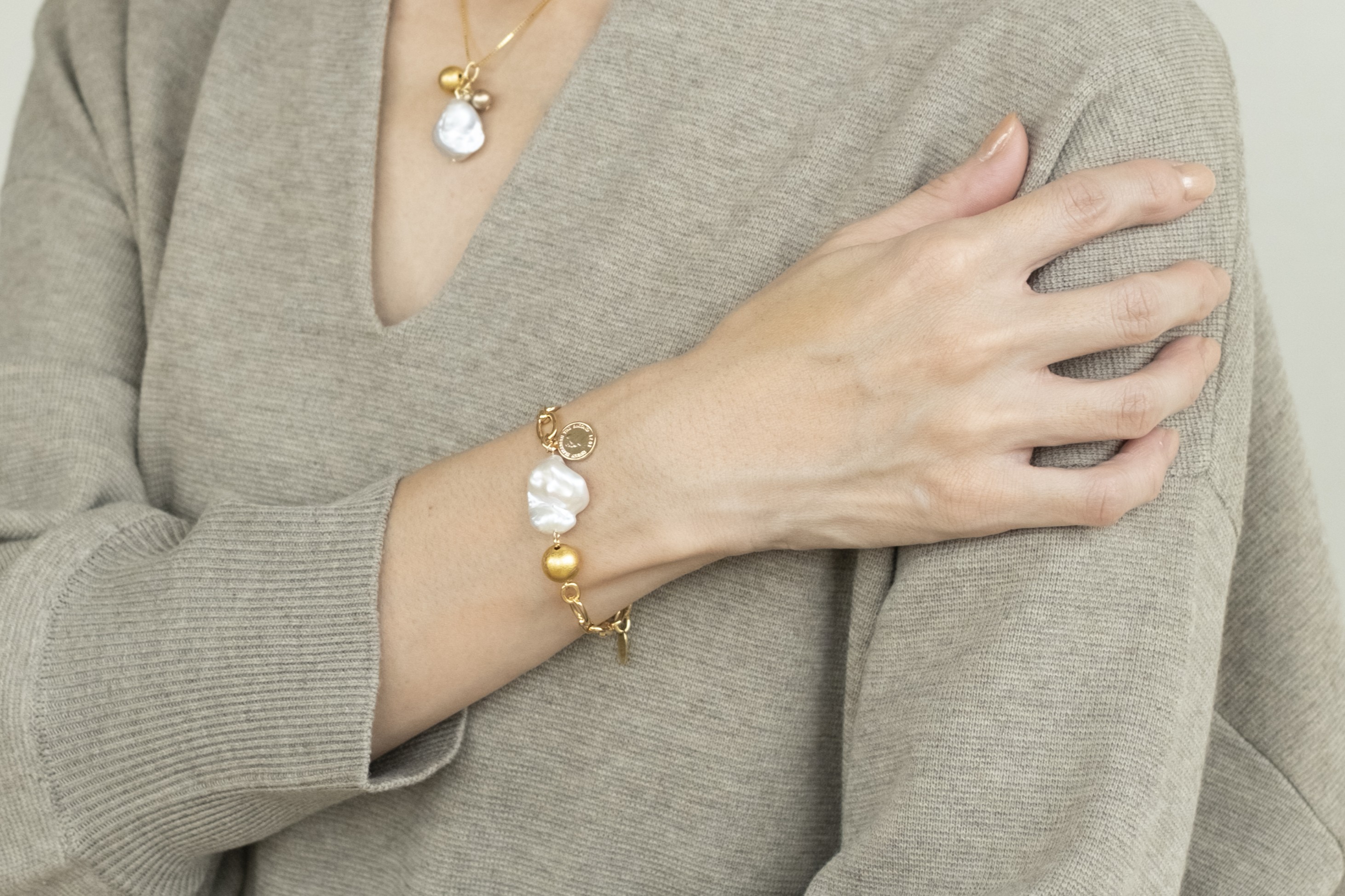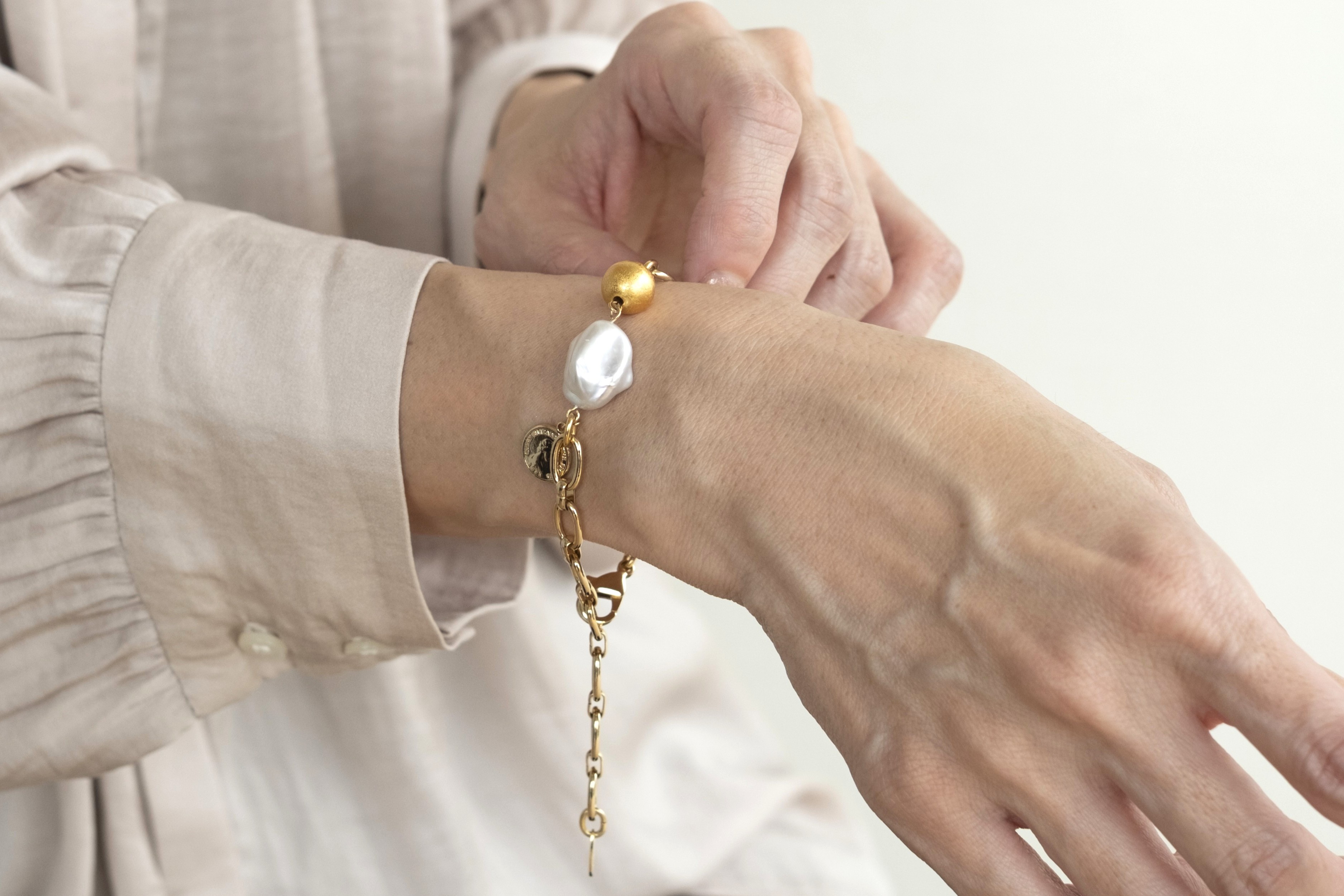 大振りのデザインチェーンに、個性が魅力のバロック型の淡水パールと、「永遠色」の箔珠を配し、アクセントにコインチャームをつけました。手元を印象的に華やかに彩ってくれます。 チェーンのどこでも金具が留められるので、手首のサイズに合わせて長さが調節出来ます。最長約20cmの長めのチェーンで幅広い方に対応可能です。