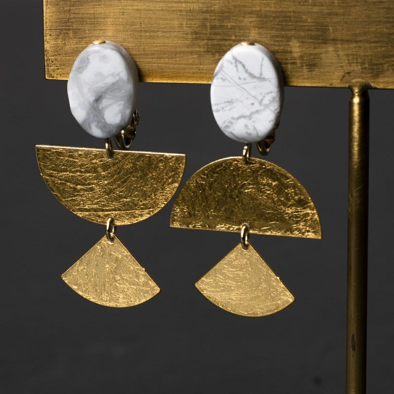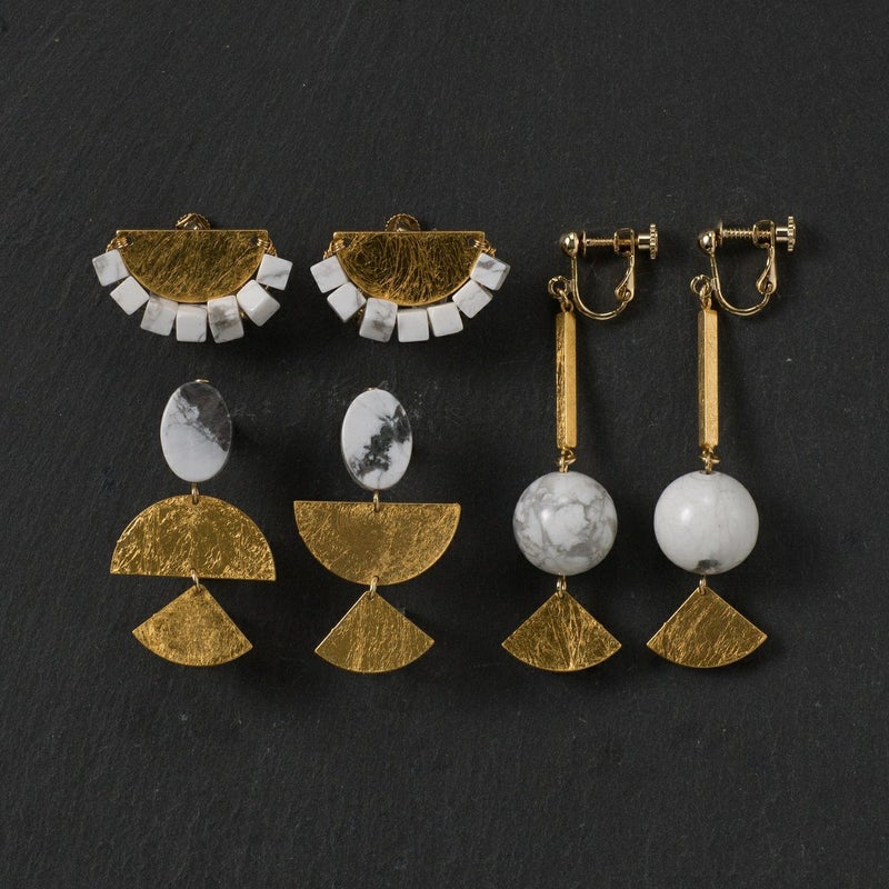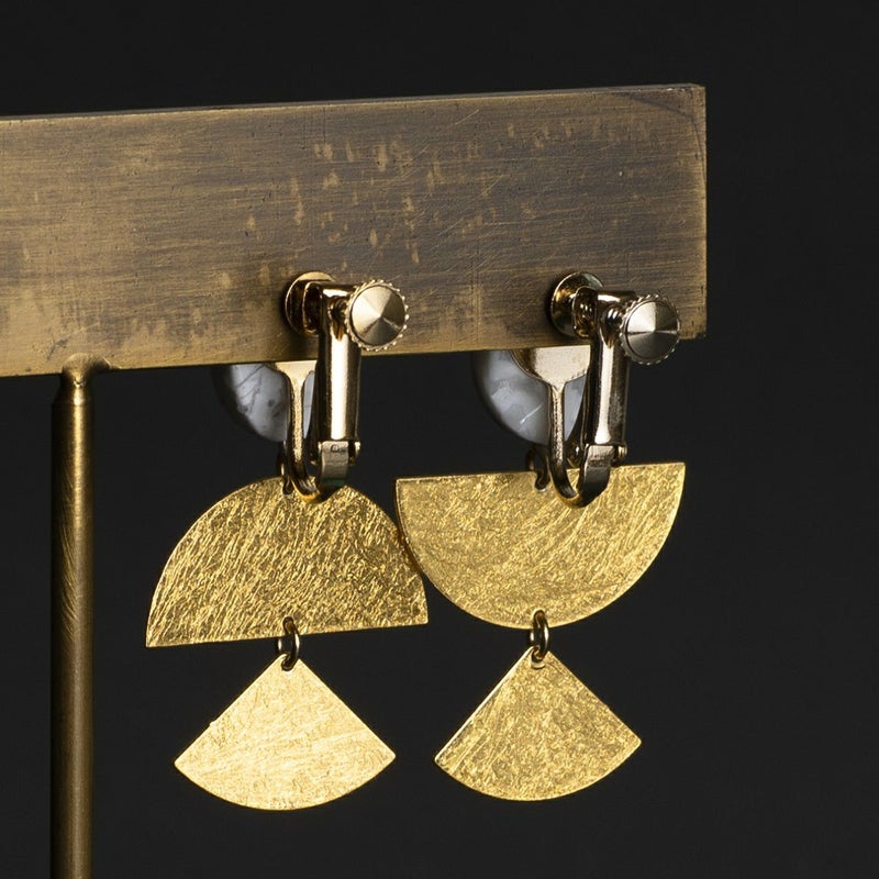 商品説明品名の”FA”は「ファン(扇)」の略。楕円形のハウライトの下に、箔を施した扇型の真鍮製プレートが軽やかに揺れます。片耳づつほんの少し違うアシンメトリーなデザインが、遊び心を感じさせるイヤリングです。個性的な印象の中にも、大ぶり過ぎない適度なサイズ感で着けやすいデザイン。イヤリング金具は、使いやすいネジバネ式です。