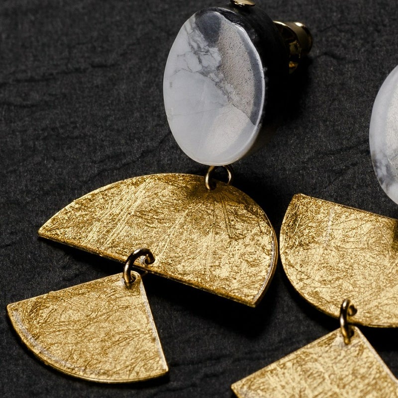 純金プラチナ箔・永遠色(純金99%、純プラチナ1%)、真鍮、銅、ハウライト(マグネサイト)、真鍮イヤリング金具(ゴールドメッキ)
