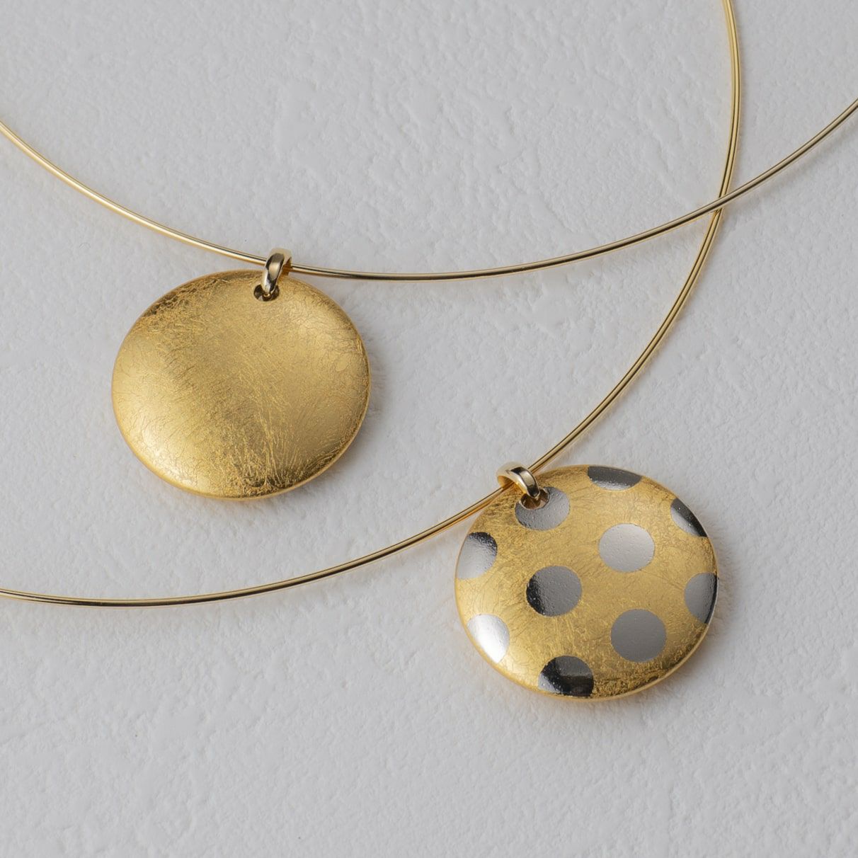 商品説明深みのある黄金色の輝きが美しい、箔座独自の箔「純金プラチナ箔・永遠色(とわいろ)」を使用。土台に銀色メッキを施した円盤型のトップに、ドットの抜き柄で箔を施しました。