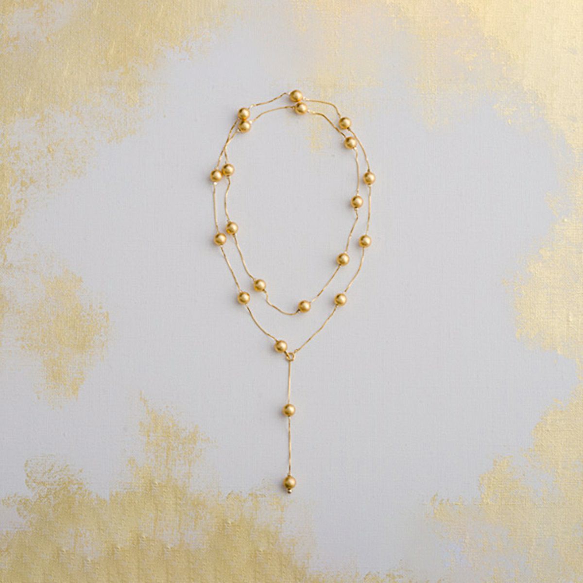 チェーン部分に金具をひっかけ、箔珠の位置で止めて使う仕様なので、長さの調整が可能です。そのままですっきりとお使いいただくのはもちろん、垂れる部分を前にしてY字ネックレスにしたり、2連にしてショートネックレスにしたりと、さまざまにお楽しみいただけます。