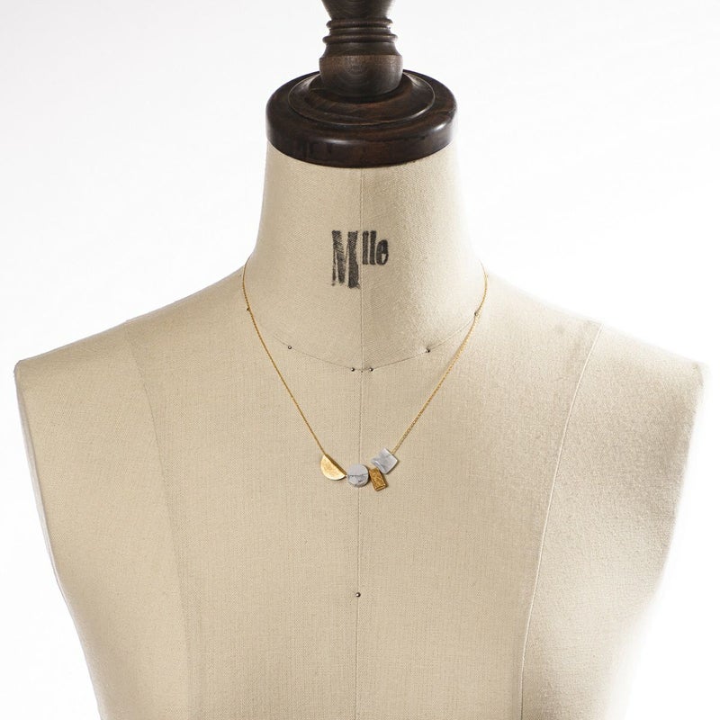 商品説明品名の”GE”は「ジオメトリック(幾何学的)」の略。半円・円・長方形・四角と、様々な形のパーツが並んだ、まさにジオメトリックの魅力がつまったネックレスです。小ぶりのサイズ感が、さりげない個性と遊び心を感じさせます。アジャスターの無いすっきりとしたデザイン。パーツはランダムに回転しますので、その時々の形状を楽しんでください。