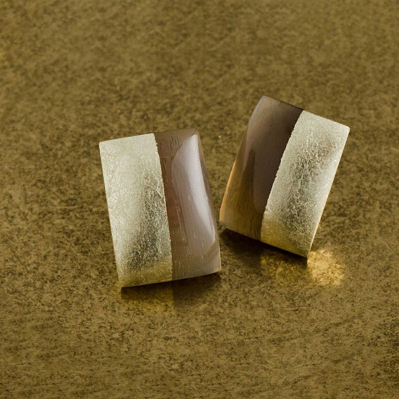 商品説明ふっくらとした厚みのある長方形型の水牛ホーンパーツは、ブラウンベージュの奥行きのある自然な濃淡が美しく、箔との大胆なコントラストが、シャープでモダンな印象を与えます。ピアス金具のポスト(針)部分は、アレルギーに配慮したチタン素材。着け易く、かつ外れにくいツボ型のキャッチ仕様です。