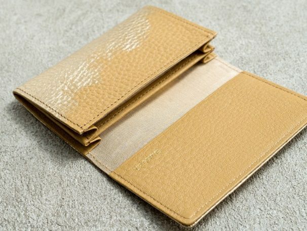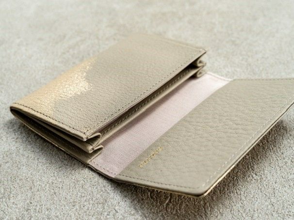 メインのカードポケットが2箇所、かぶせ側にもマチ無しのポケットが1か所あり、仕分けがしやすい仕様。メイン2箇所はマチ付なので、沢山の名刺やカードが入ります。