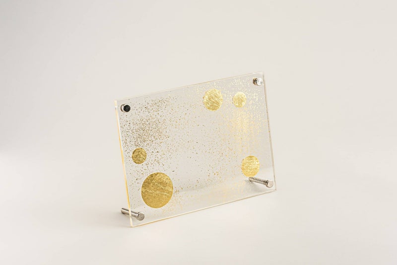 金箔(断切四号色・2枚入)×1、アクリルフォトフレーム×1(アクリルプレート×2枚、金具×1セット)、ドット柄マスキングシール(大×1、中×2、小×2)×1セット、砂子筒(中目)×1、たたき筆×1、台紙(金箔を切るときの台紙)×1