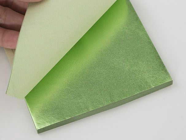 箔の束を白色の包装紙と帯で包む伝統的なパッケージ形態です。表面に種類、色、入り枚数を記載しています。