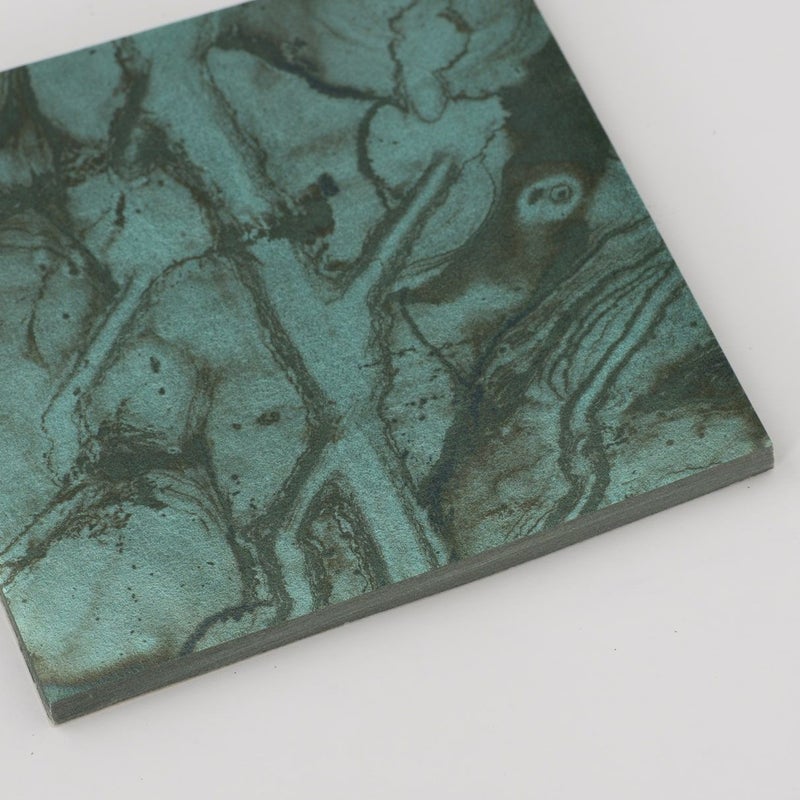商品説明箔と和紙が交互に重なっています。箔の束を白色の包装紙と帯で包む伝統的なパッケージ形態です。表面に種類、色、入り枚数を記載しています。