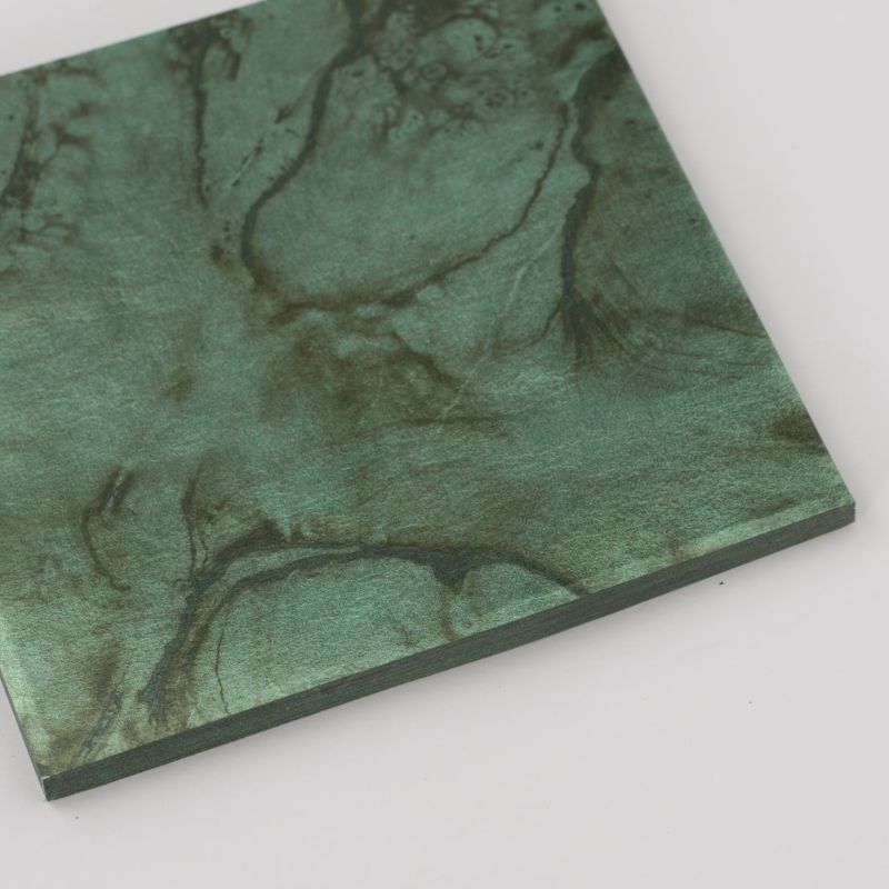 色箔は銀箔の両面を合成樹脂と染料でコーティングした着色箔です。 「銀」は変色しやすい金属ですので、お使いの環境などによって変色の進度も異なります。製造時期(ロット)により、色調が異なる場合がございます。また性質上、カケや継ぎ、ひび割れ等が混ざる場合もございます。予めご了承ください。