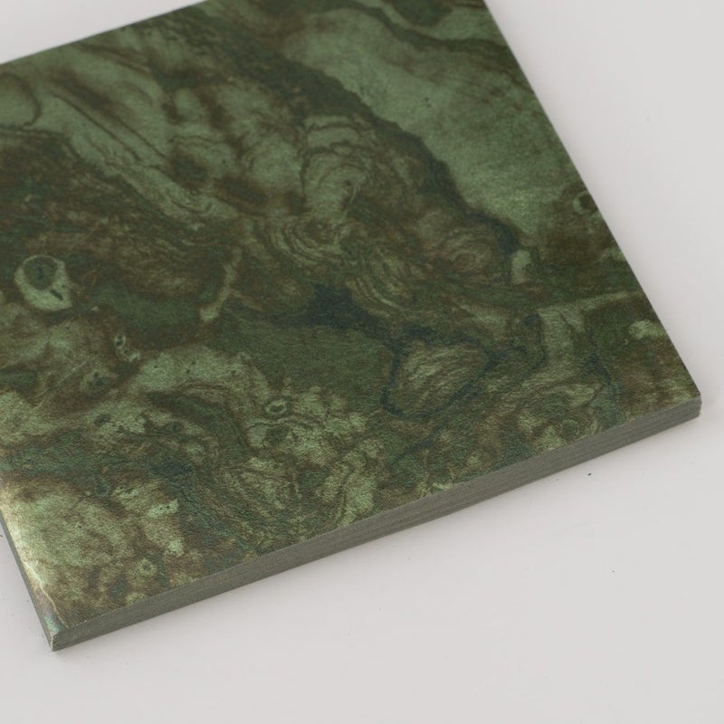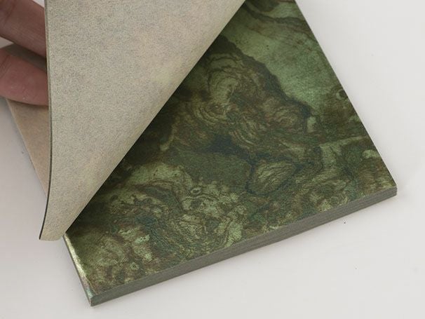 商品説明箔と和紙が交互に重なっています。箔の束を白色の包装紙と帯で包む伝統的なパッケージ形態です。表面に種類、色、入り枚数を記載しています。
