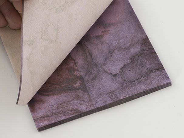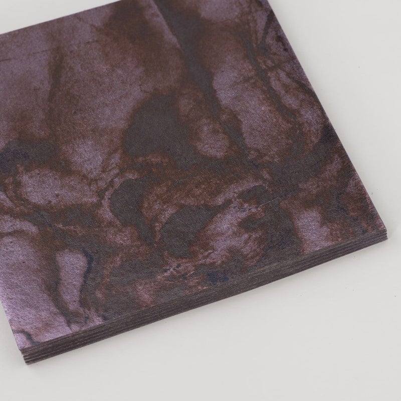 商品説明箔と和紙が交互に重なっています。箔の束を白色の包装紙と帯で包む伝統的なパッケージ形態です。表面に種類、色、入り枚数を記載しています。