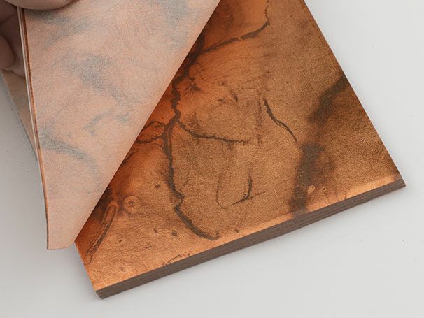 商品説明箔と和紙が交互に重なっています。箔の束を白色の包装紙と帯で包む伝統的なパッケージ形態です。表面に種類、色、入り枚数を記載しています。