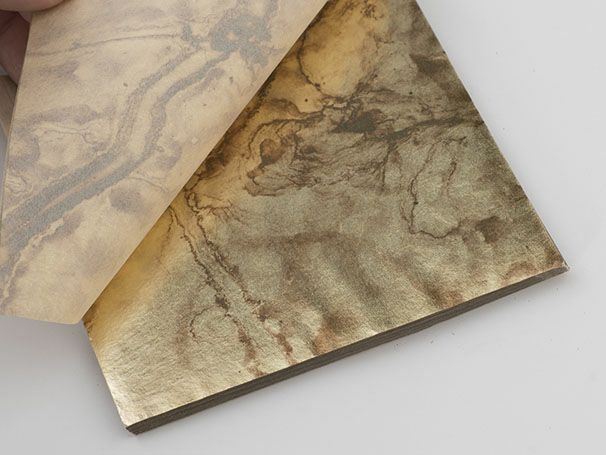 商品説明箔と和紙が交互に重なっています。箔の束を白色の包装紙と帯で包む伝統的なパッケージ形態です。表面に種類、色、入り枚数を記載しています。