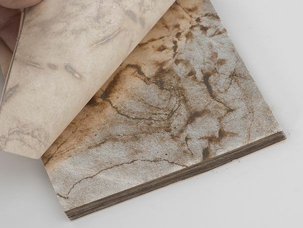 商品説明箔と和紙が交互に重なっています。箔の束を白色の包装紙と帯で包む伝統的なパッケージ形態です。表面に種類、色、入り枚数を記載しています。