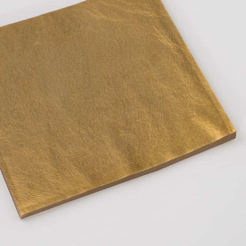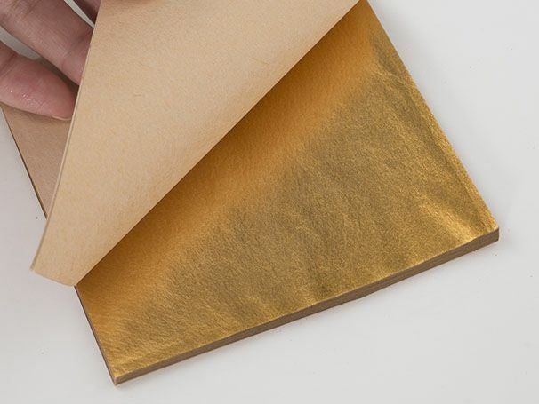箔の束を白色の包装紙と帯で包む伝統的なパッケージ形態です。表面に種類、色、入り枚数を記載しています。