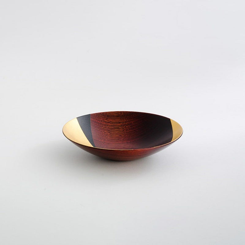 山中漆器の高度なろくろ技術で挽かれた、驚くほど薄く軽い栓(せん)の木の器に、流れるような曲線と2種の異なる下地を組み合せて箔をデザインしました。