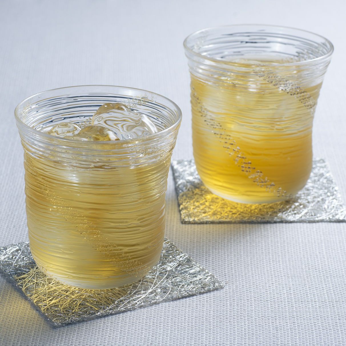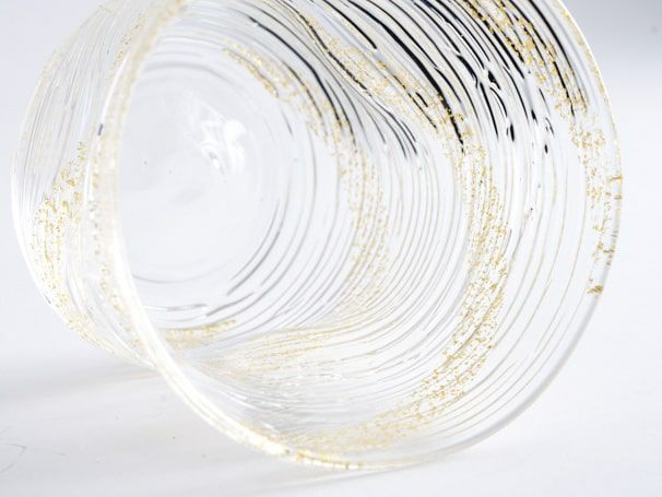 線状のガラス装飾が施された、氷のような涼やかな表情が魅力的なグラスは、金彩・銀彩が美しく映え、冷たいお飲み物やお料理を引き⽴てます。普段使いしやすいガラスのアイテムは、ペアで贈りものとしても人気です。
