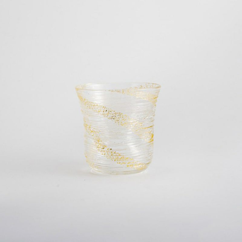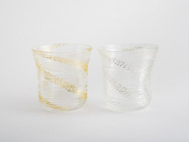 氷のような涼やかなデザインが魅力的な、ガラスの器。氷を思わせる線状のガラス装飾が施され、金彩が美しく映えます。職人の手により一点ずつつくられたグラスは、あえて不規則な形状でデザインされ、手になじみやすく使いやすいかたち。冷茶やジュースなどの冷たいお飲み物を一層美味しく引き立てます。金銀ペアで、ギフトとしても人気のアイテムです。