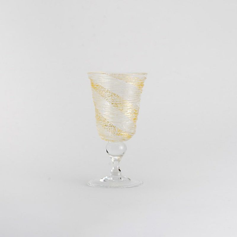 氷のような涼やかなデザインが魅力的な、ガラスの器。氷を思わせる線状のガラス装飾が施され、金彩が美しく映えます。職人の手により一点ずつつくられたグラスは、あえて不規則な形状でデザインされ、手になじみやすく使いやすいかたち。美味しいワインと共にグラスの美しさもお楽しみいただけます。金銀ペアで、ギフトとしても人気のアイテムです。