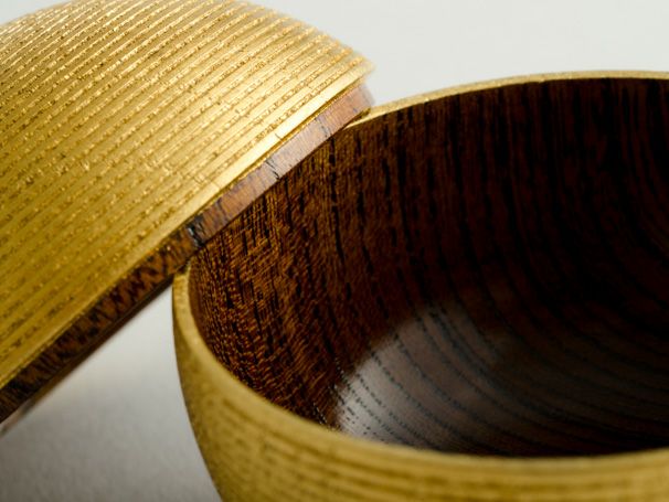 山中漆器の高度なろくろ技術で細かな筋を装飾挽きした小物入れは、外側の全面をていねいに箔で覆っています。内側は欅(けやき)の美しい木目を活かした拭き漆仕上げ。細やかに挽かれた凹凸と、それに沿う薄く柔らかな箔が、独特の陰影をもたらします。